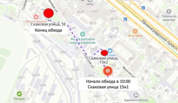 «Обход начнется с улицы Скаковая, д. 15, корп. 1 и завершится по адресу: ул. Скаковая, д. 18», — говорится в сообщении.